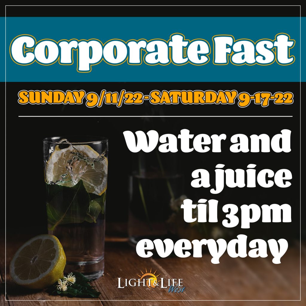 Daily Sep 11thToSep 17th Corporate Fast Every day from September 11 to September 17 Honoring God’s Faithfullness for 19 Years 9/11 – 9/17 CORPORATE FAST BROCHURE 2022 Save the Date SHARE ON Twitter Facebook Buffer LinkedIn Pin It